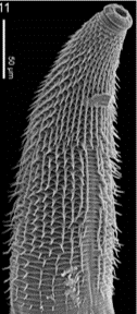 - Conical tail, subulate, ending in a sharp tip